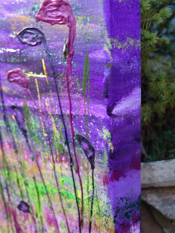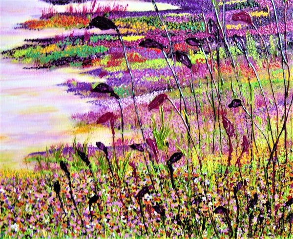 Purple morning dreams is geschilderd met donkere en lichte purple kleuren. Bloemen op de voorgrond en een prachtig pad met water tot aan de horizon. Nadat et landschap klaar is dan begint Ans met het toevoegen van honderden kleine witte dots, nu lijkt het alsof je in het landschap kunt treden., een wonderful effect. Zou een mooie eyecatcher bij u aan de muur kunnen zijn. Ieder schilderij is uniek.Te koop via galerie ArtFusion, Villa Arena, Amsterdam.