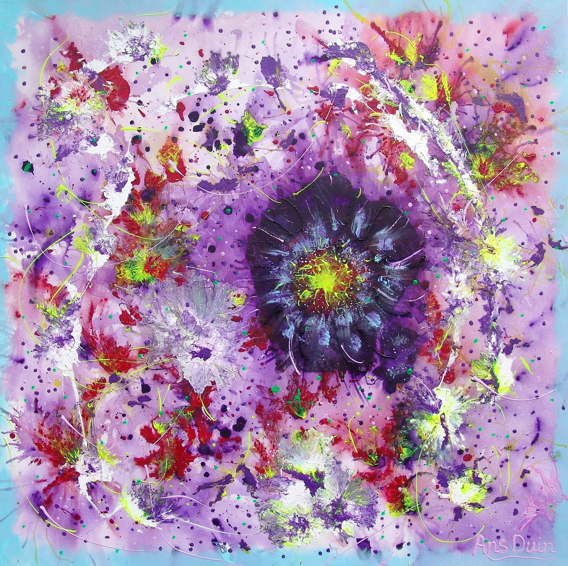Kleurig abstract schilderij waarvan je vrolijk wordt. Mooie paarse kleuren op een zachtblauwe ondergrond. Acryl op premium cotton en afgewerkt met vernis voor behoud van de heldere kleuren incl. ophangsysteem.