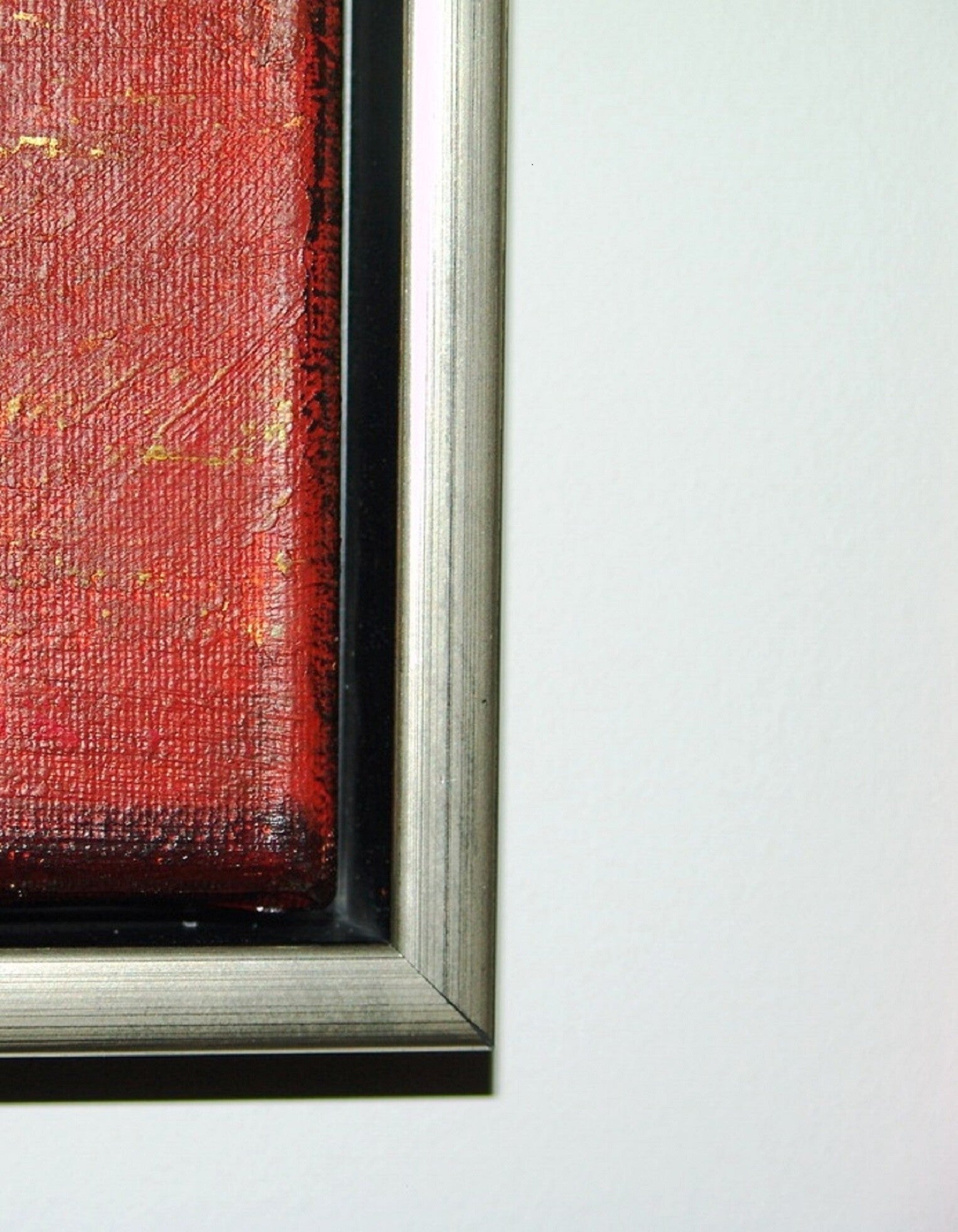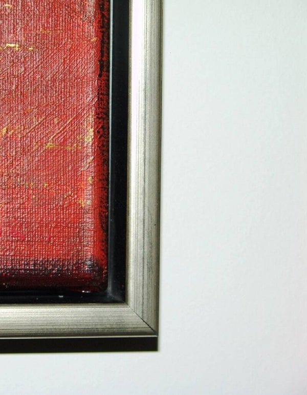 Prachtig schilderij in warme kleuren geel, bruin en oranje. Gevat in een mooie lijst, zilveer + zwart en incl. ophangwerk.