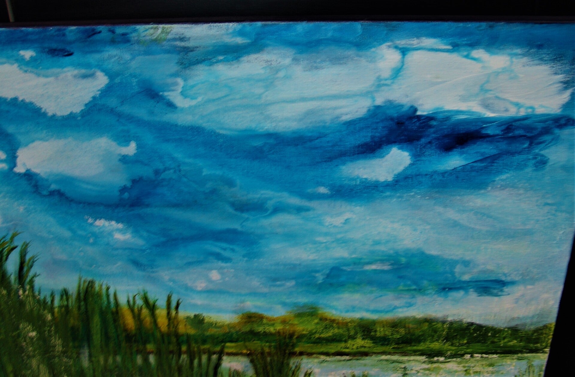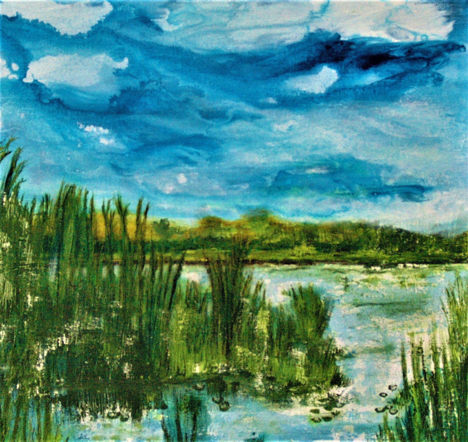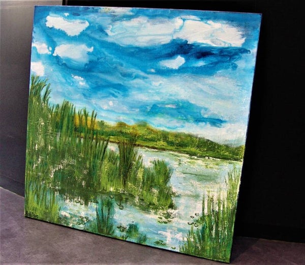 Wuivend riet in een waterrijk landschap, geschilderd met acryl op linnen, het linnen gevat in een aluminium frame en incl. ophangwerk, zijkanten beschilderd en behoeft geen extra omlijsting. Maat 90 x 90 cm.