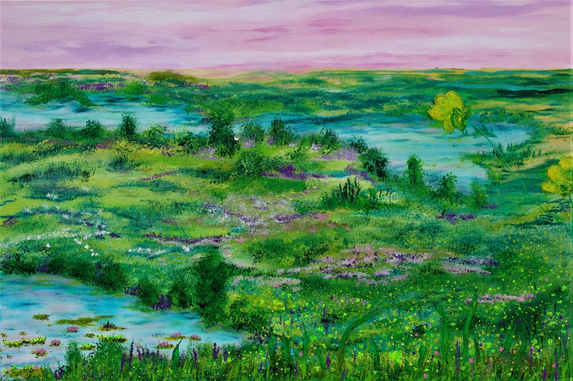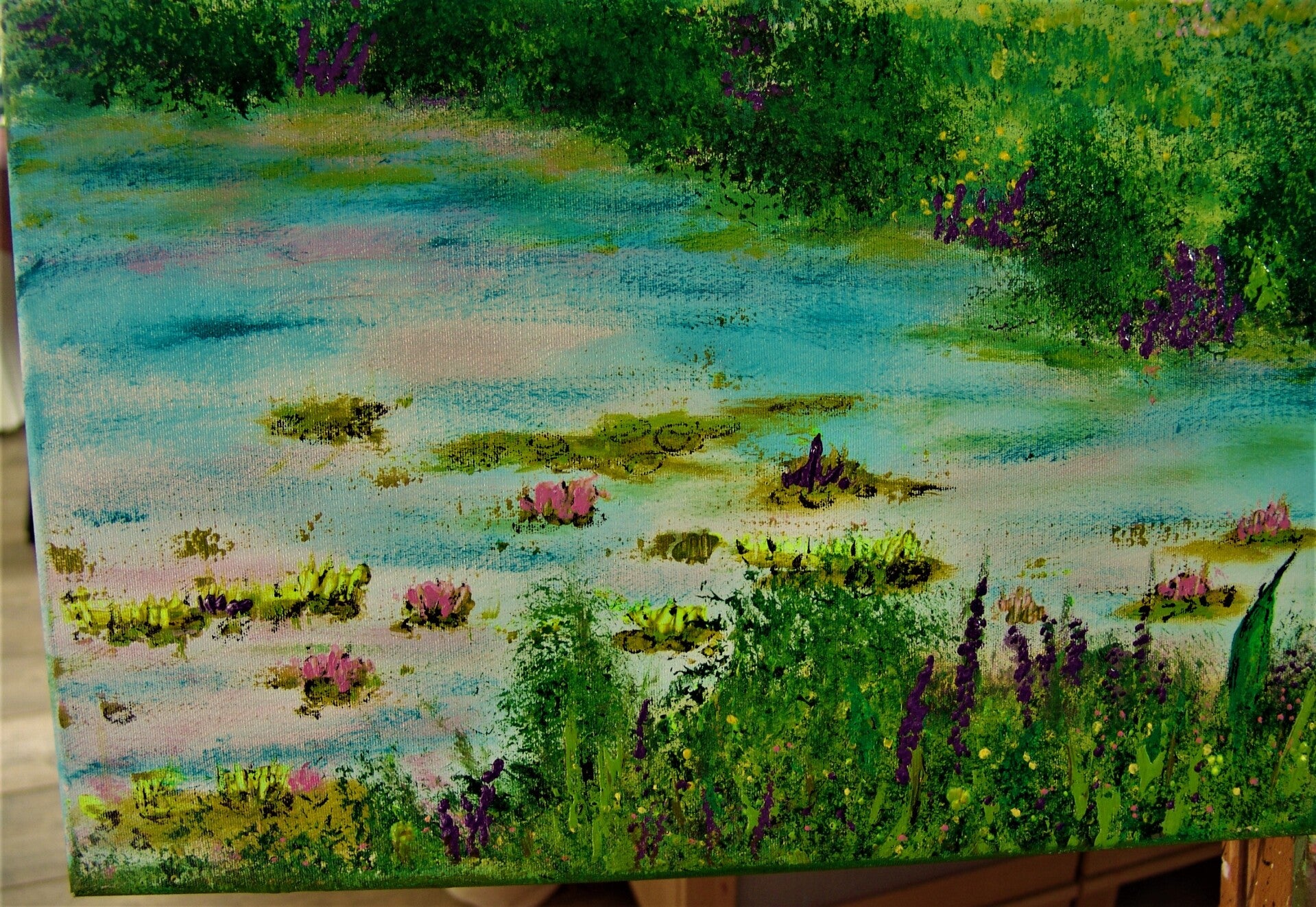 Garden of eternal spring. Mooi landschap waar je in weg kunt dromen, mooie details geschilderd met acryl op linnnen. Zijkanten ook beschilderd, behoeft geen omlijsinting.Incl. ophangsysteem.