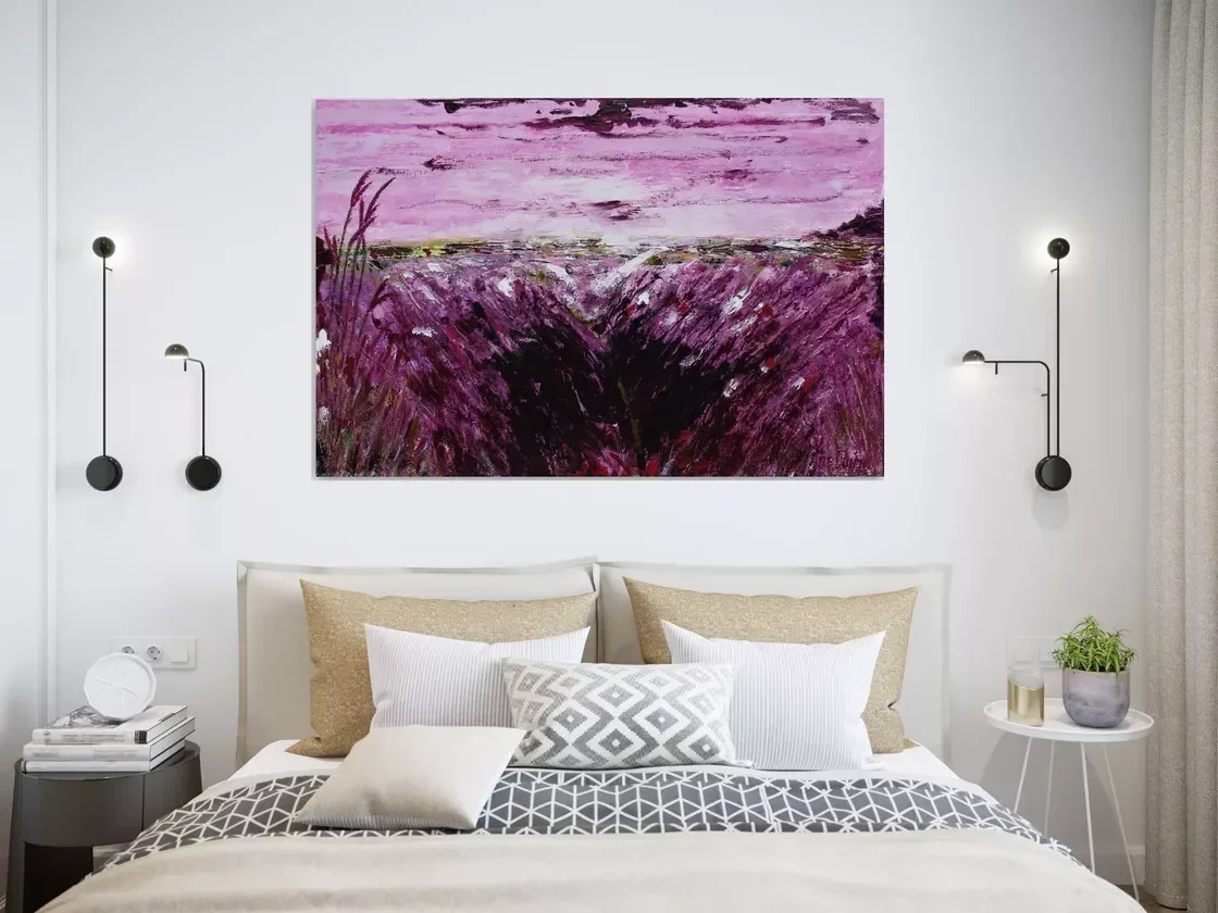 Dit schilderij weerspiegelt het vakantie gevoel van Frankrijk. De geur van de uitbundig groeiende lavendel, hier geschilderd in dieppaarse kleuren. Acryl op linnen, afgewerkt met vernis. Incl.ophangmateriaal.