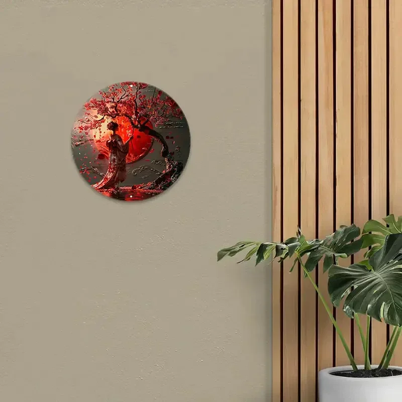 Alluminium bord met prachtig weergegeven japanse vrouw i kimono met bloesem in warm rood. Middellijn 20 cm.(0023)gratis verzending.