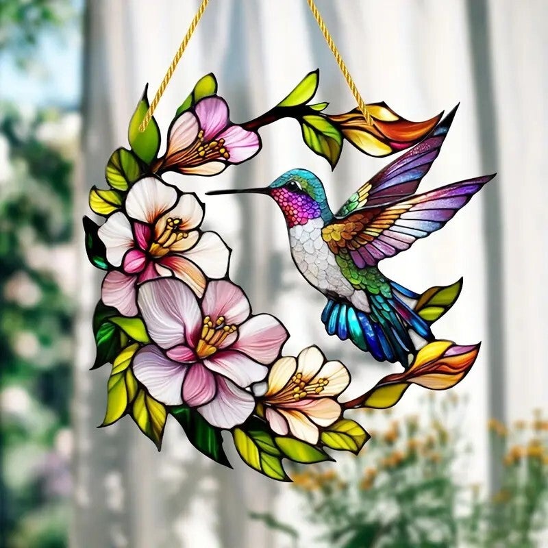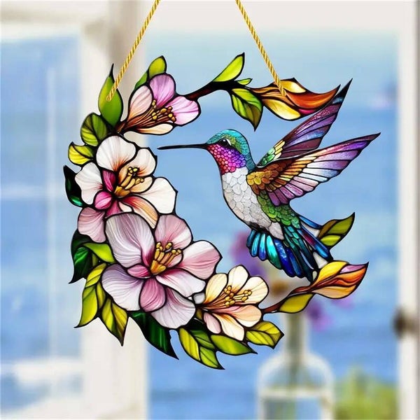 Zeer mooie raamhanger, gedeelte met bloemen en vervolmaakt met de kolibrie. Doorsnee 20 cm. (0028A)