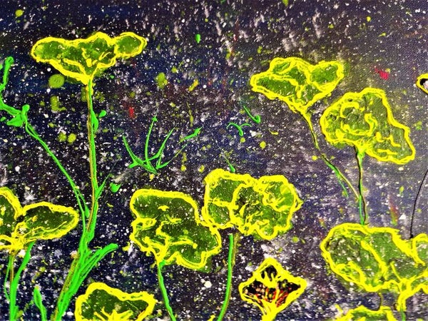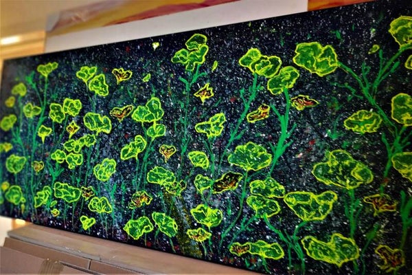 Heel apart schilderij, door het laag over laag te schilderijen ontstaat het 3D-effect en door de fluoriserende verf. Afgelakt met vernis, bldijvend mooie heldere kleuren. Incl. ophangwerk.