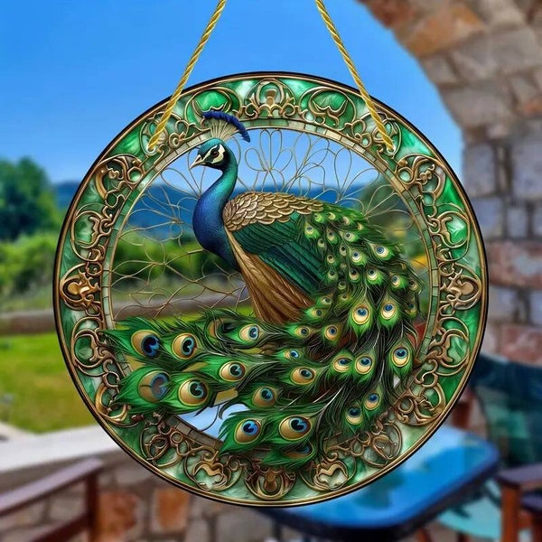 En weer zo'n mooie raamhanger met blauwgroene pauw en volle bos met veren. Omgeven door aparte rand met ronde vormen. Doorsnee 20 cm. (0044)