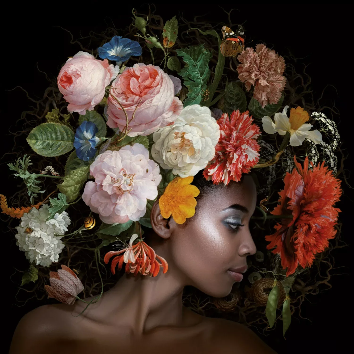 Eigentijds prachtig portret van donker meisje met bloemen om het en op het hoofd. Dit moderne portret te bestellen op aluminium art vervaardigd en geprint in Nederland. Incl. önzichtbaar"ophangsysteem secuur verpakt verzonden.