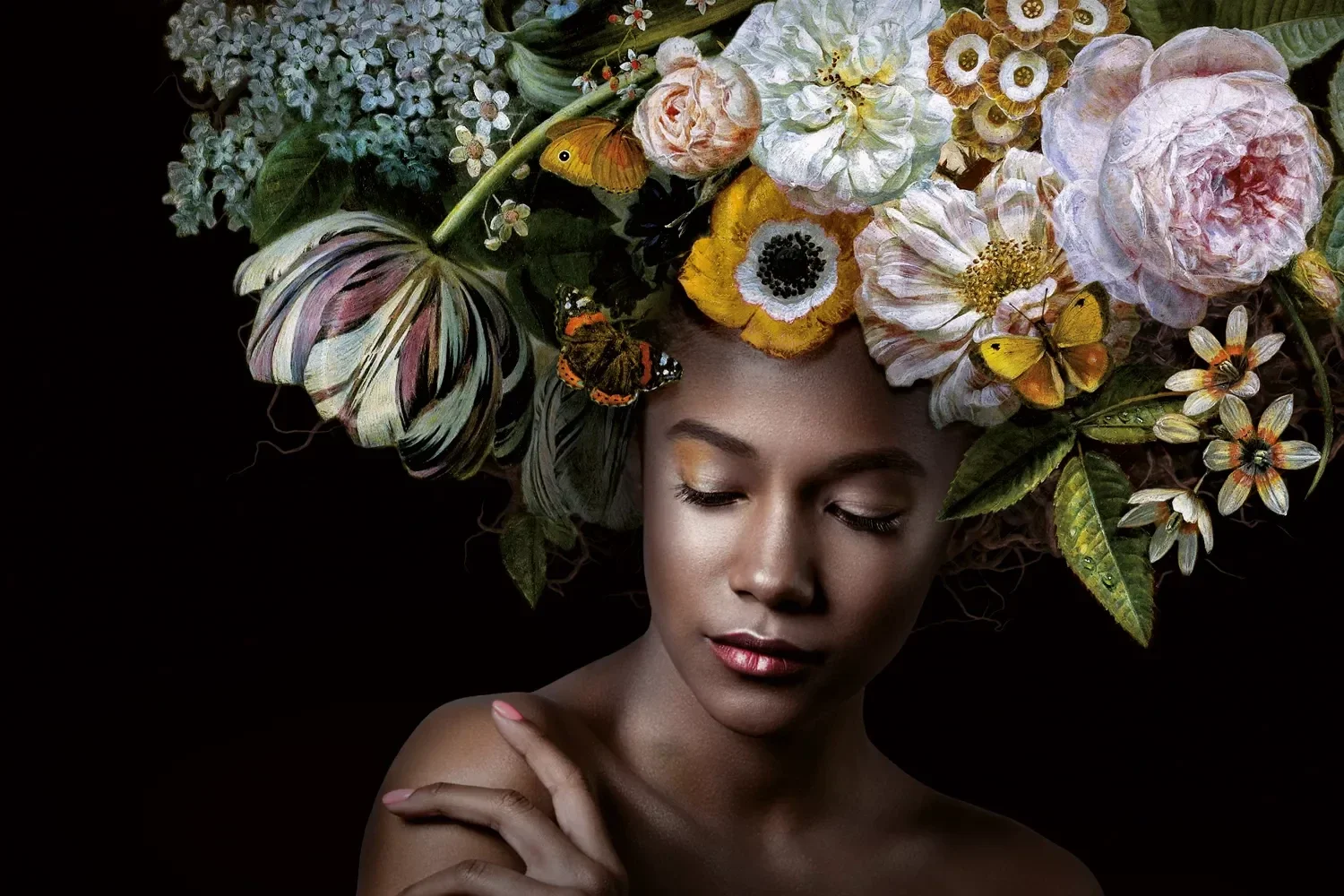 Portret van donkere dame met prachtige bloemen. Nu te bestellen op aluminium art incl. önzichtbaar"ophangsysteem. Hier kijkt u met plezier naar.