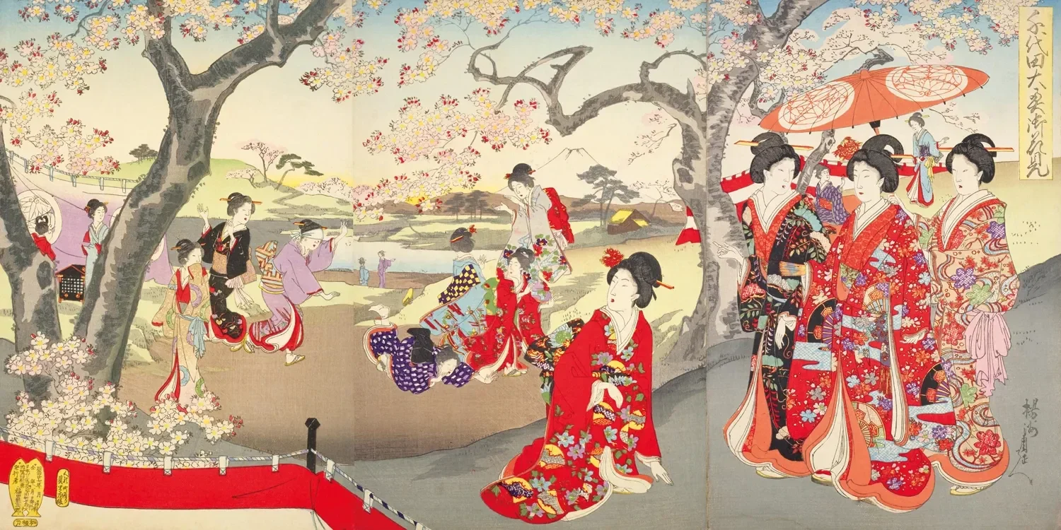 Japanse geisha's relaxing in een rustgevende tuin met bomen en bloesem. Traditionele kimono's in mooie kleuren rood geven dit schilderij net dat tintje exclusiviteit en warmte. In diverse maten te bestellen op aluminium art. Wordt geleverd inclusief ophangsysteem en gratis verzending.