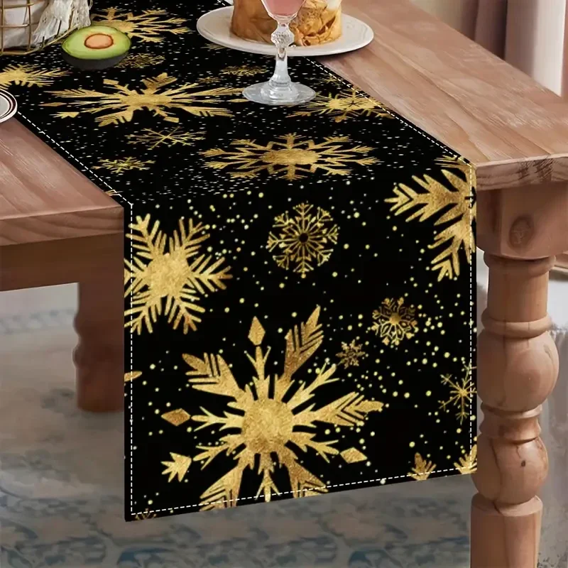 Geweldig toch zo'n chique tafelloper van zwart meteen decor van goudkleurige sneeuwvlokken en kersterren. Om helemaal alvast in de sfeer van de feestelijke decembermaand te komen. (0075)