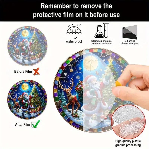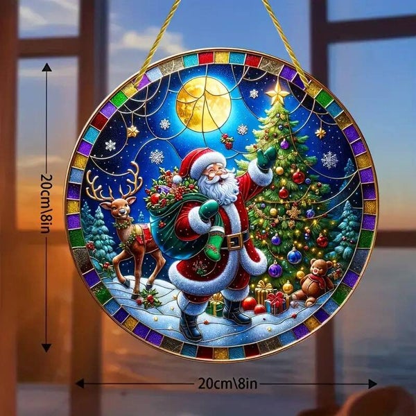 Gezellige raamhanger voor de feestdagen met de Kerstman die de slingers ophangt. Foto 2 is hoe u na ontvangst de beschermfolie van de hanger afhaalt. (0064) Doorsnee 15 cm.