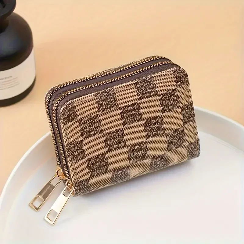 Stijlvolle damesportemonnee, modieus geruit patroon, dubbele rits, veel vakken voor uw cards en geld. rijs/lichtbruine uitvoering qua kleur. (0108)