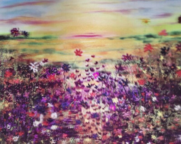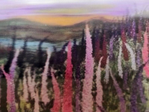 Uniek schilderijtje in 3D geprint van een veld met lupines naar een groot schilderij van Ans Duin. Ingelijst in een mooie brede zwarte lijst en incl. ophangsysteem.Schilderijtje in 3Dpint is 4A-formaat, Paarse binnenlijst 2 cm. en buitenlijst zwart kunststof 4,5 cm.