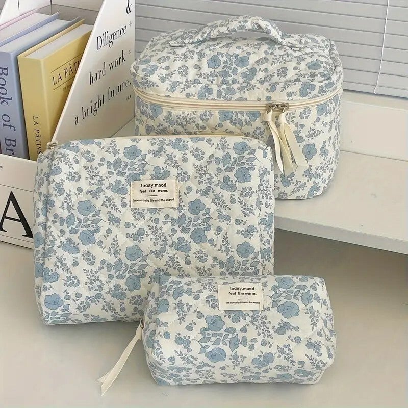 3-delige set cosmeticatassen, bestaande uit kleine toiettas, grote toilettas en een prachtige beautycase. stevige canvasstof met een dessin van blauwe bloemetjes. (0202) Hoge kwaliteit en voor een vriendelijke prijs aangeboden. Gratis verzending als pakket.