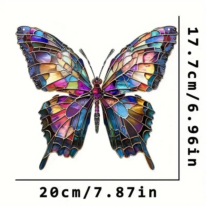 Kleurrijke vlinder. Vaaak wordt een vlinder geassocieerd met een overleden geliefde. Zo is op mijn moeders graf een vlinder gegraveerd. Als herinnering of gewoon omdat je van vlinders houdt hang je deze vlinder voor je raam. (0220) Doorsnee 20 cm.