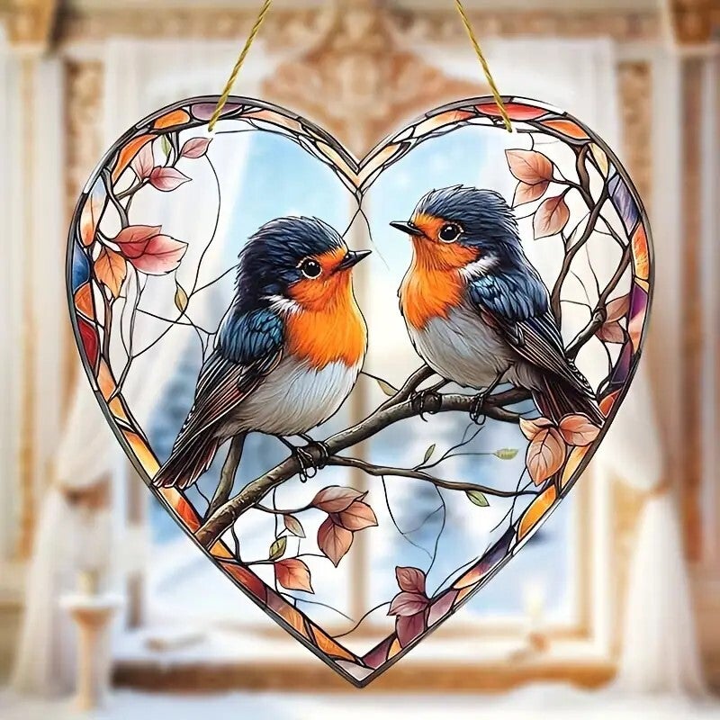 is dit niet een lief geschenk voor de feestdagen ? Zo schattig deze twee roodborstjes op tak in een hartvormige raamhanger. Maat 20 cm. (0273) En gratis verzending!