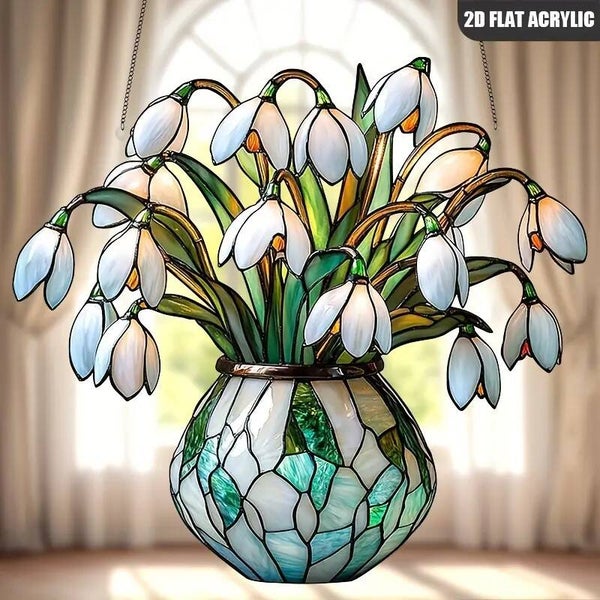Nee, we zetten de bloemeetjes niet buiten maar we halen ze naar binnen. Prachtige grote raamhanger in de vorm van een vaas met sneeuwklokjes. Hoe mooi wil je het hebben? Maat 27 x 25 cm. (0277)