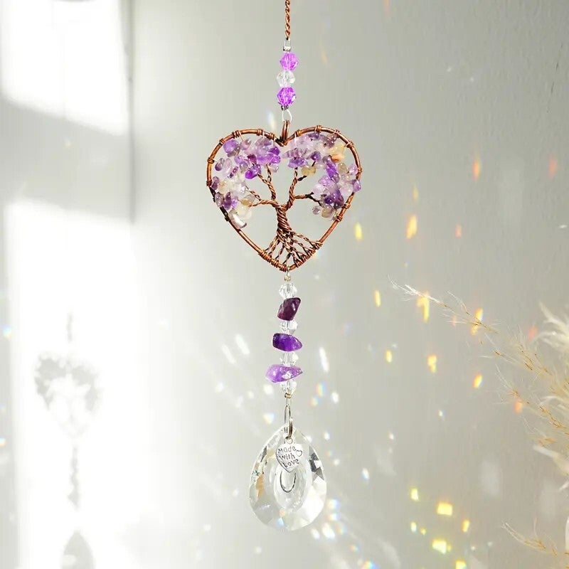 Een zonvanger in de vorm van een hart waarin een evensboom in paars amethist. Onderaan de ketting een druppelvormige steen. (0278)