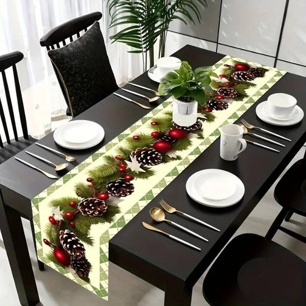 Gezellige kerstloper met rondom rode ballen. en denneappels.. Mooie kwaliteit geweven polyester met linnen. Maat 183 x 33 cm. (0120)