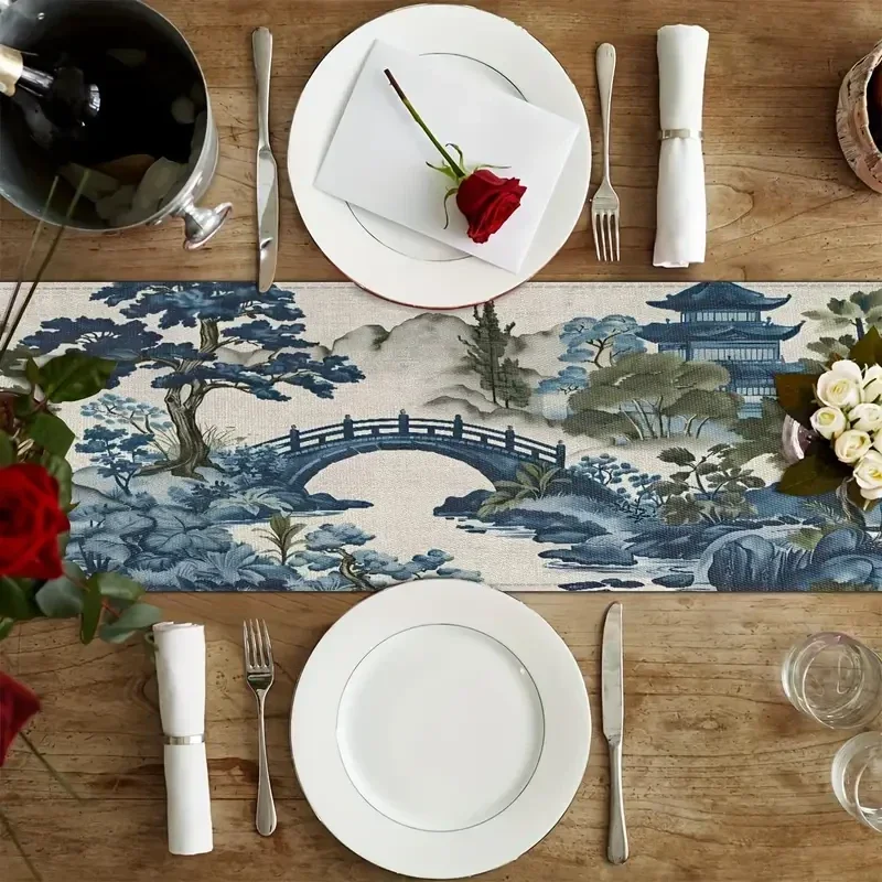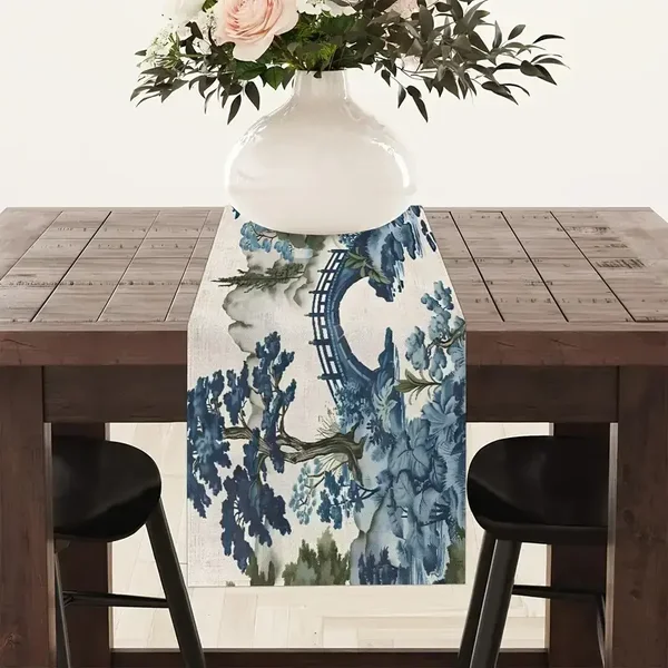 En weer zo'n mooie loper in Japanse stijl met een prachtig landschap in blauwe tinten uitgevoerd op een ecru ondergrond. Maat 33 x 183 cm. (0299) Gratis verzending.