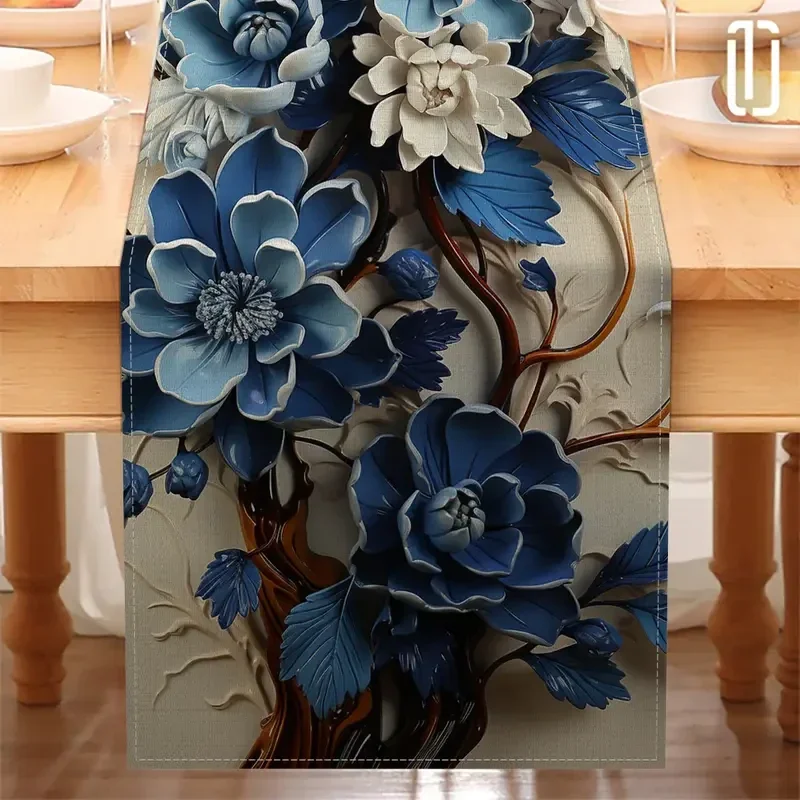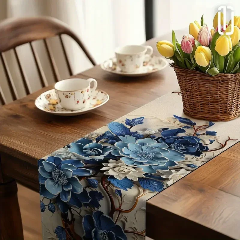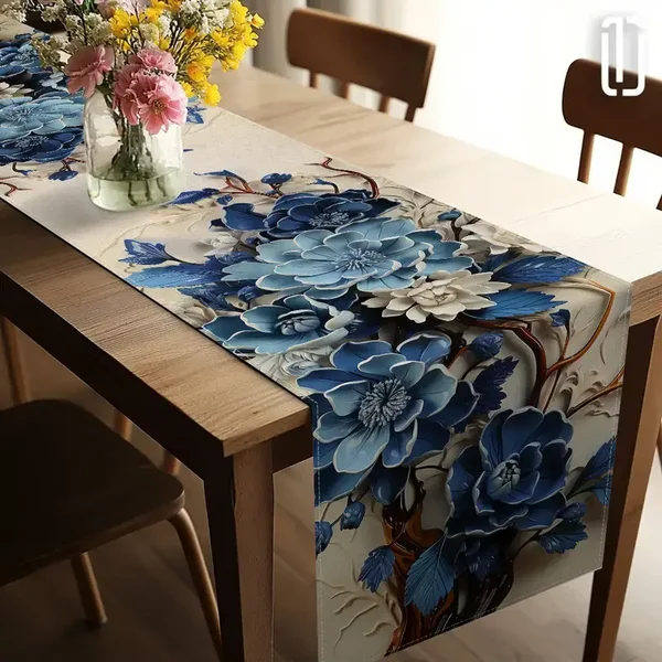 Stijlvolle tafelloper met blauw en witte bloemen, kortom een plaatje op je tafel, verbaas je gasten met deze prachtig gestylde tafel voor diner of lunch. In voorraad, gratis verzending.(0300).
