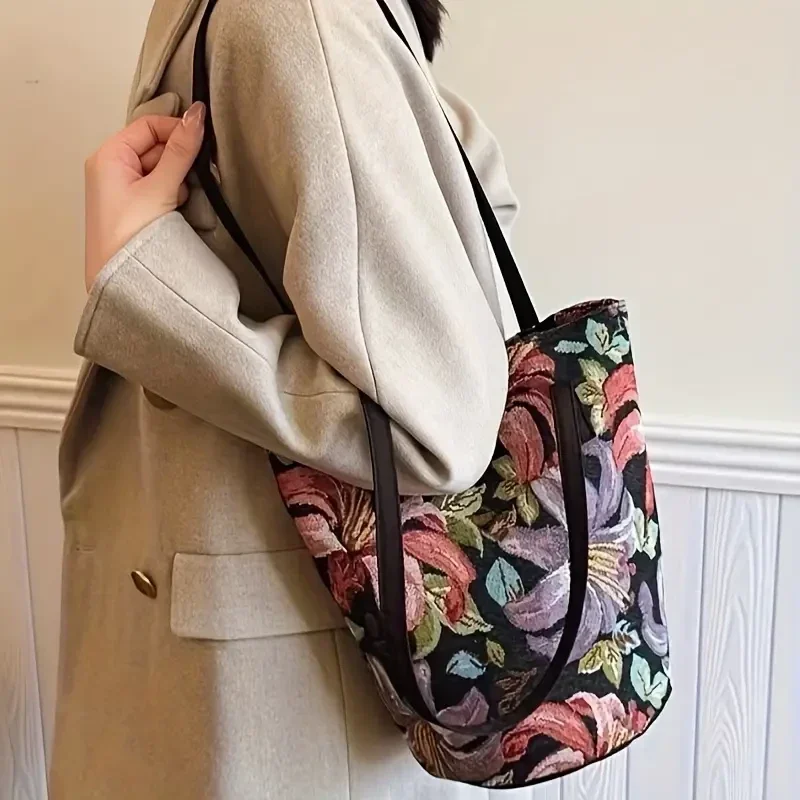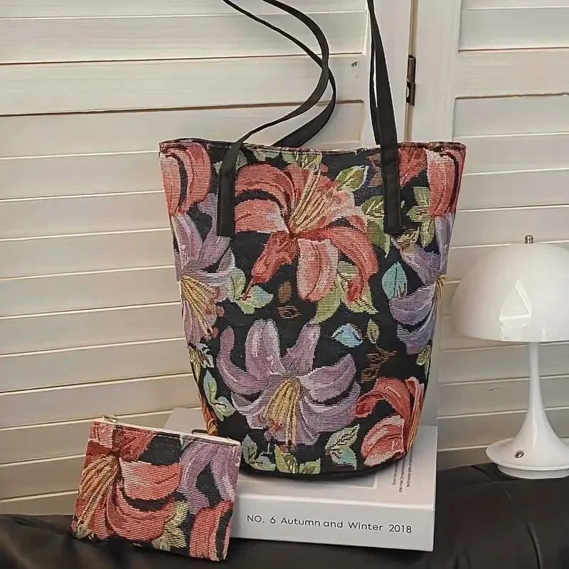 Een hele leuke tas met bloemen in emmermodel, ondergrond is in zwarte kleur met grote rode en paarse bloemen, geweven polyester, clipsluiting, gevoerd, Foto's voor details erbij en qua maten. (0343)