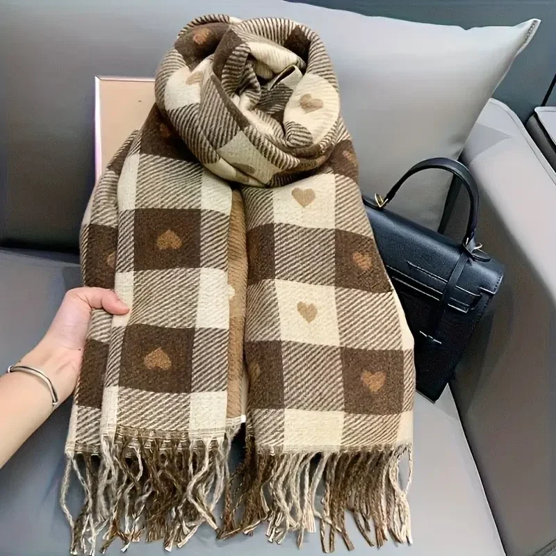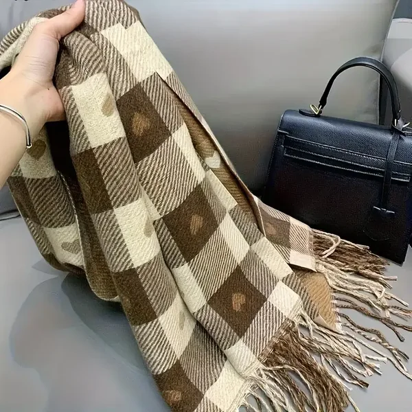 Grote dikke geblokte sjaal in koffiekleur en beige patroon. Warme wintersjaal met franje. Casual stijl, handwasbaar, gebreid polyester (0385)