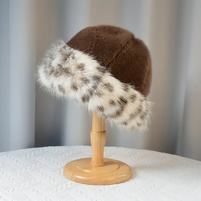 Heerlijk warme en stijlvolle bruinkleurige wintermuts met dikke rand nepbont in luipaardprint. Past bij iedere winterjas of jack. Makkelijk op te zetten, zachte pluche stof. Feestelijk accessoire. (nr.0430A)