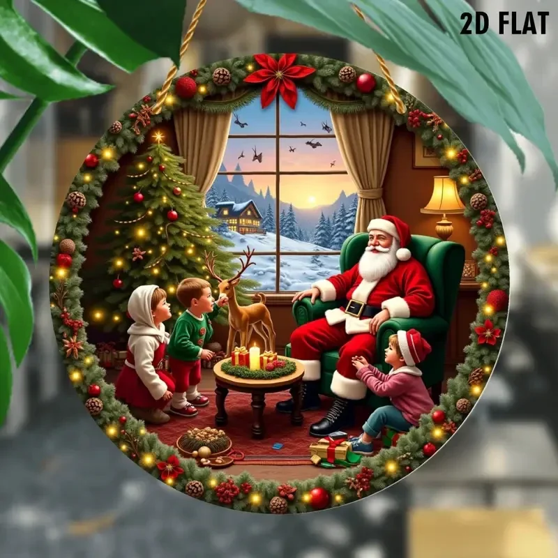 Een gezellige raamhanger met kersttafereel, de kerstman verhalen vertellend aan de kinderen. Buiten door het raam een besneeuwd landschap. Doorsnee 20 cm. (0427).